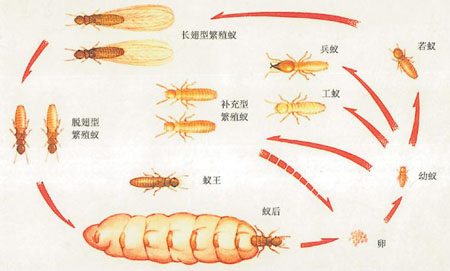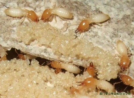 一巢成齡的臺灣乳白蟻,它們的成員有蟻皇、蟻后、兵蟻、工蟻。若蟻等。它們的結(jié)構(gòu)式非常之嚴謹,品級分工清楚,蟻皇授精,蟻后產(chǎn)卵,兵蟻守衛(wèi),工蟻覓食勤務,若蟻待成熟長翅,分飛自立成巢。白蟻怕光,喜陰暗潮濕的環(huán)境。工蟻外出覓食,將食物消化轉(zhuǎn)換成養(yǎng)分,喂養(yǎng)巢內(nèi)各品級白蟻,白蟻個體與個體之間營養(yǎng)均衡,相互清潔身體,相互撫慰,主要造成我們家居破壞的是工蟻——“破壞王”,它們尋找食物的半徑約100米。